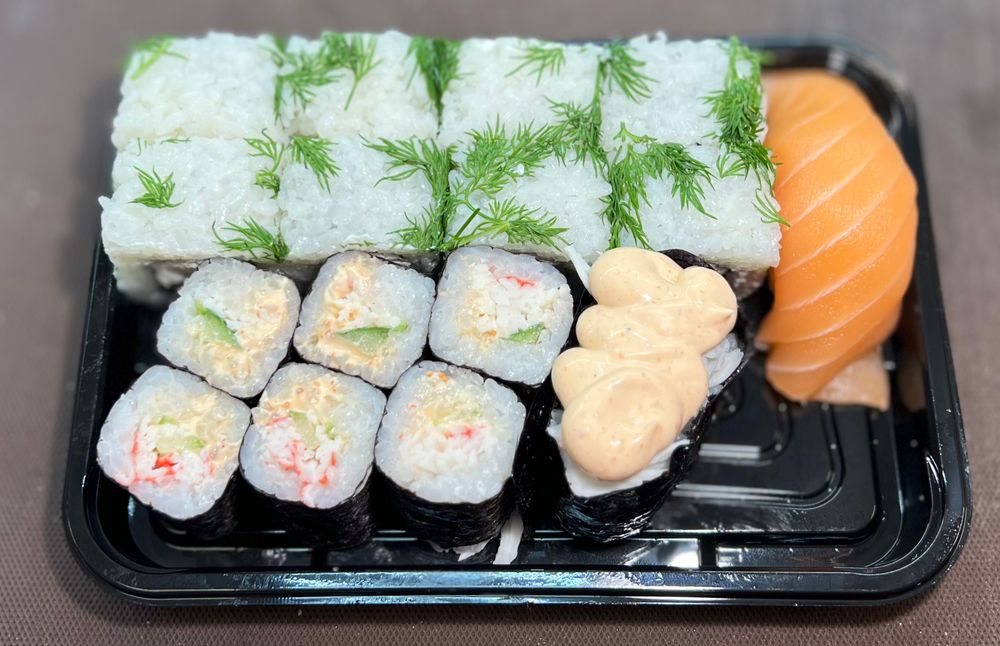 Роллы: Австрия, Хикари-краб, Суши: Лосось Спайси краб Порция 16 шт.