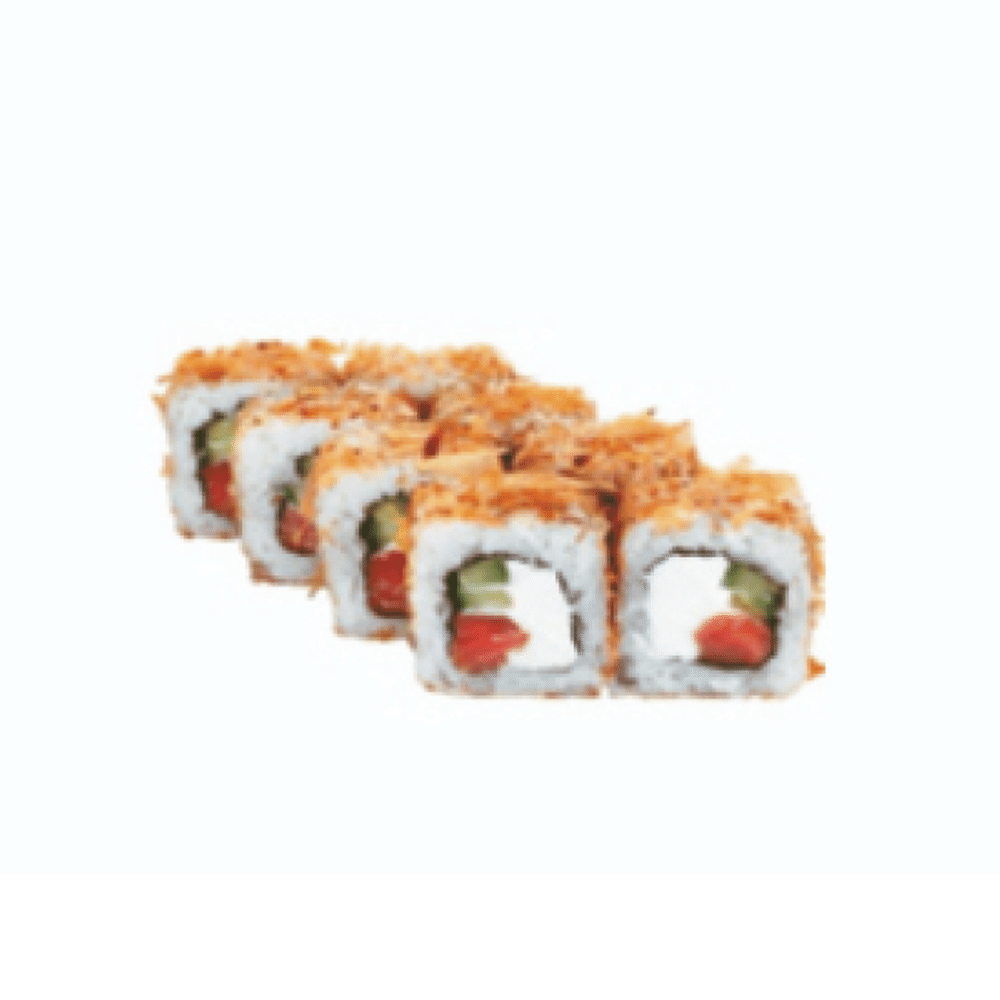 Рис, нори, сыр, огурец, лосось, стружка тунца