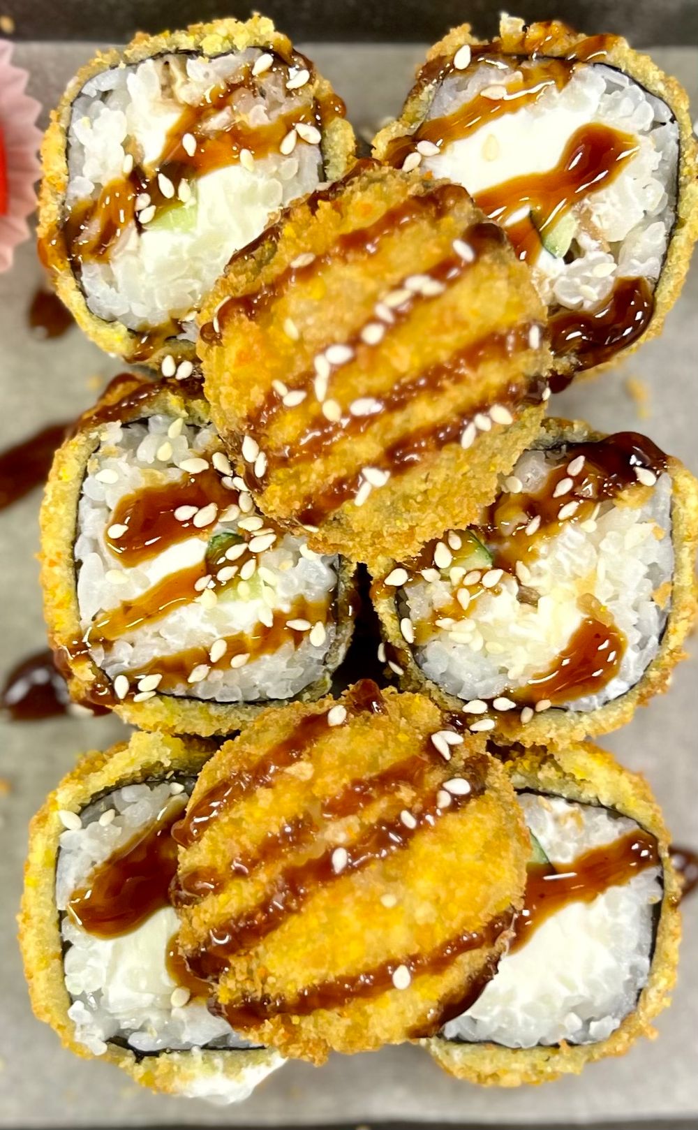 Рис, нори, сыр, темное мясо лосося, огурец, Кляр, панировочные сухари.