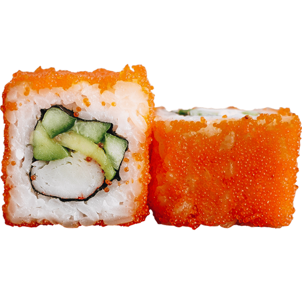 Рис, нори, огурец, крабовые палочки, майонез, масаго оранжевая.