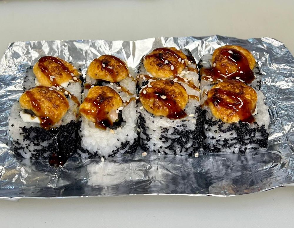 Рис, нори, сыр, огурец, лосось, угорь, спайси соус, тобико чёрная